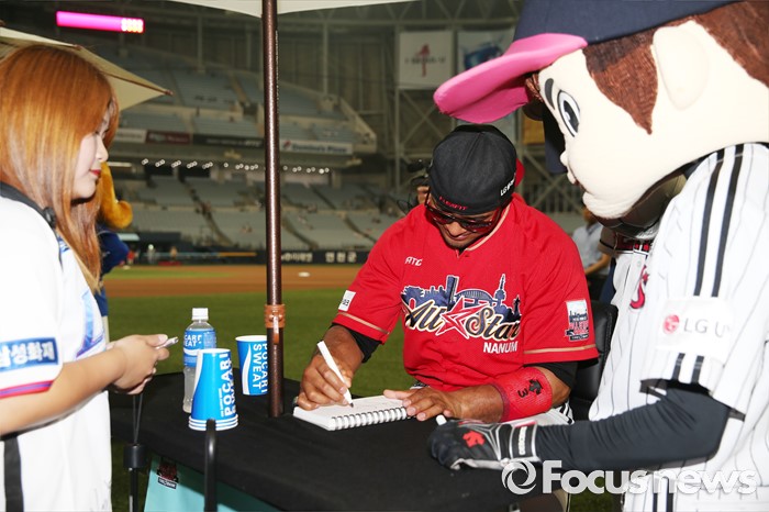 (서울=포커스뉴스) 16일 서울 고척 스카이돔에서 열린 2016 프로야구 올스타 경기에 앞서 가진 팬사인회에서 나눔팀의 히메네스가 팬에게 사인을 해 주고 있다.