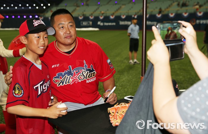 (서울=포커스뉴스) 16일 서울 고척 스카이돔에서 열린 2016 프로야구 올스타 경기에 앞서 가진 팬사인회에서 나눔팀의 조인성이 어린 팬과 기념사진을 찍고 있다.
