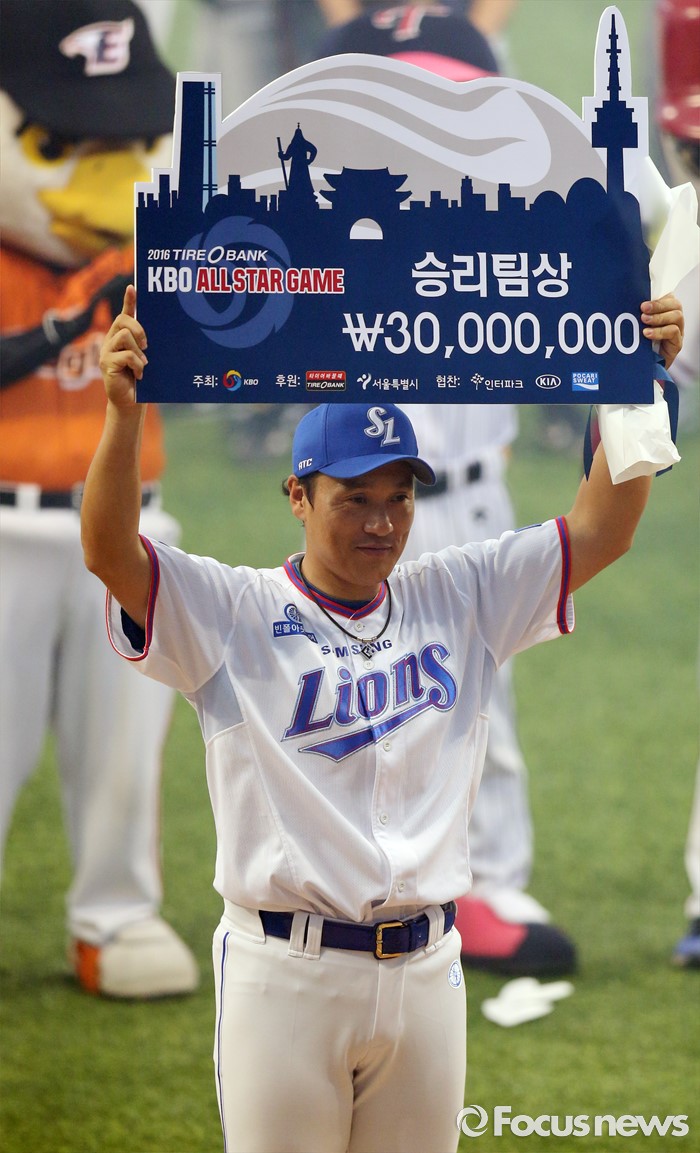 (서울=포커스뉴스) 16일 서울 고척 스카이돔에서 열린 2016 프로야구 올스타전에서 드림팀 주장 이승엽이 승리팀상 상패를 들어 보이고 있다.