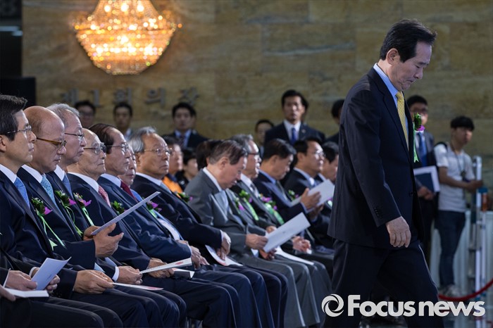 (서울=포커스뉴스) 정세균(오른쪽) 국회의장이 17일 오전 서울 영등포구 여의도 국회의사당 중앙홀에서 열린 제68주년 제헌절 경축식에 참석해 경축사를 위해 무대로 오르고 있다.