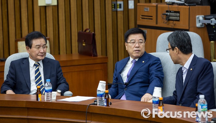 (서울=포커스뉴스) 김광림(가운데) 새누리당 정책위의장과 변재일(왼쪽) 더불어민주당 정책위의장, 김성식 국민의당 정책위의장이 18일 오전 서울 여의도 국회에서 열린 '3당 정책위의장-경제부총리, 3차 민생경제 현안점검회의'에 참석해 대화 하고 있다.