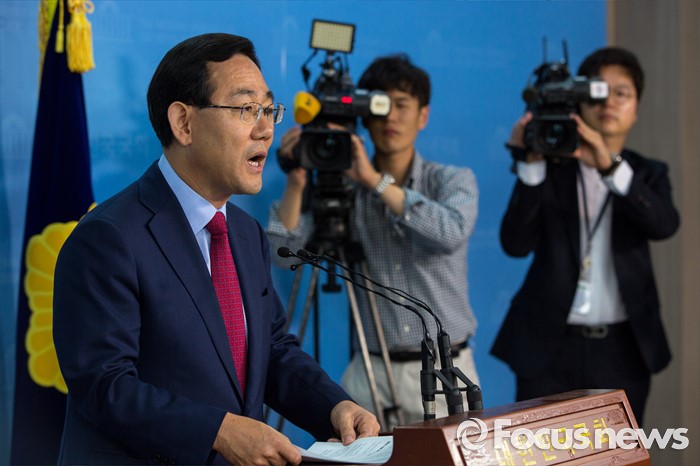 (서울=포커스뉴스) 주호영 새누리당 의원이 18일 오전 서울 여의도 국회에서 오는 8월9일 열릴 전당대회 당대표 출마 선언을 하고 있다.