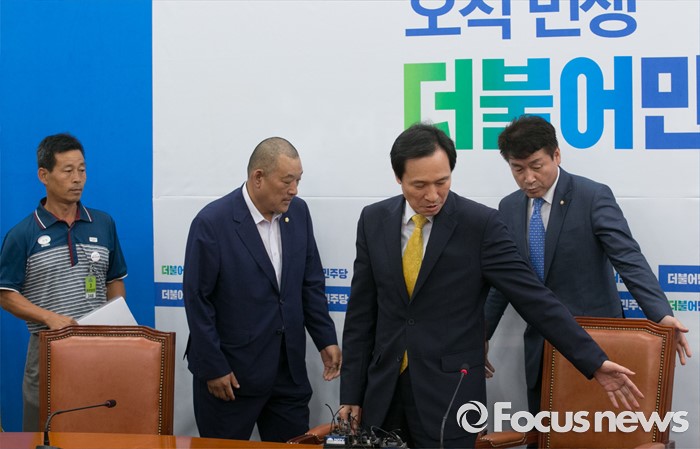 (서울=포커스뉴스) 우상호 더불어민주당 원내대표가 18일 오전 서울 여의도 국회에서 열린 사드반대 전국대책회의 등 관련단체와의 면담에 참석해 관계자들을 안내하고 있다. 오른쪽부터 기동민 원내대변인, 우 원내대표, 노광희 성주군의회 의원, 이재동 성주군 농민회장.