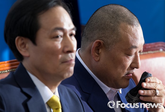 (서울=포커스뉴스) 18일 오전 서울 여의도 국회에서 열린 우상호 더불어민주당 원내대표와 사드반대 전국대책회의 등 관련단체 면담에 참석한 노광희(오른쪽) 성주군의회 의원이 땀을 닦고 있다.
