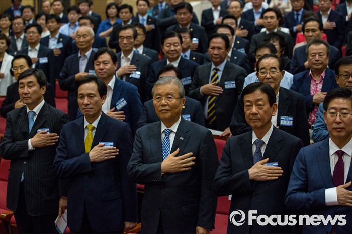(서울=포커스뉴스) 김종인(앞줄 가운데) 더불어민주당 비상대책위 대표가 18일 오후 서울 여의도 국회의원회관에서 열린 '더불어민주당 중앙위원회의'에 참석해 국민의례 하고 있다.