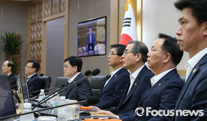 (세종=포커스뉴스) 19일 오전 세종시 정부세종청사 국무회의장에서 서울-세종 간 영상회의로 열린 국무회의에 참석한 국무위원들이 황교안 국무총리의 발언을 경청하고 있다. 왼쪽부터 윤성규 환경부장관, 이동필 농림축산식품부장관, 정진엽 보건복지부장관, 이기권 고용노동부장관, 정재찬 공정거래위원장,김동극 인사혁신처장, 손문기 식품의약품안전처장.