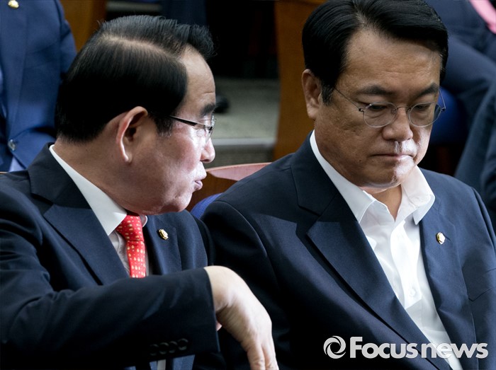 (서울=포커스뉴스) 19일 오전 서울 여의도 국회에서 열린 새누리당 의원총회에 참석한 정진석(오른쪽) 원내대표와 박명재 사무총장이 대화하고 있다.