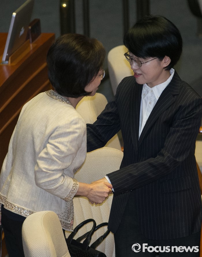 (서울=포커스뉴스) 19일 오전 서울 여의도 국회에서 열린 344회 국회(임시회) 1차 본회의, 사드(THAAD·고고도미사일방어체계) 배치에 대한 긴급현안질문에 참석한 박선숙(오른쪽), 장정숙 국민의당 의원이 인사하고 있다.