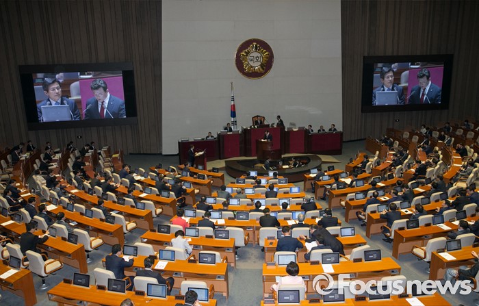(서울=포커스뉴스) 19일 오전 서울 여의도 국회에서 열린 344회 국회(임시회) 1차 본회의, 사드(THAAD·고고도미사일방어체계) 배치에 대한 긴급현안질문에 참석한 윤영석 새누리당 의원이 황교안 국무총리에게 질문하고 있다.