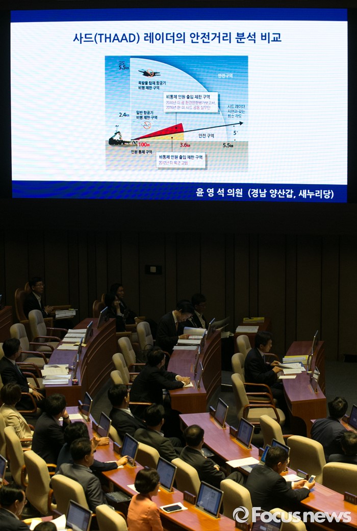 (서울=포커스뉴스) 19일 오전 서울 여의도 국회에서 열린 344회 국회(임시회) 1차 본회의, 사드(THAAD·고고도미사일방어체계) 배치에 대한 긴급현안질문에 참석한 윤영석 새누리당 의원이 사드 레이더 안전거리 분석 비교표를 보여주며 질문하고 있다.