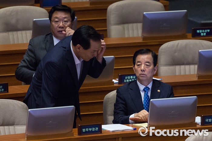 (서울=포커스뉴스) 김현웅(왼쪽) 법무부 장관과 한민구 국방부 장관이 19일 오전 서울 여의도 국회에서 열린 제344회 국회(임시회) 1차 본회의, 사드(THAAD, 고고도미사일방어체계) 배치에 대한 긴급현안질문에 참서갷 대화 하고 있다.