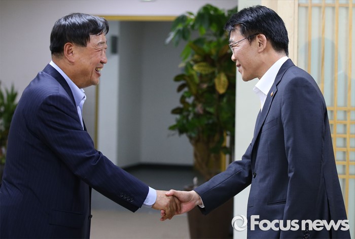 (세종=포커스뉴스) 강호인(오른쪽) 국토교통부장관이 19일 오후 세종시 정부세종청사 국토부 접견실에서 열린 평창동계올림픽 성공개최를 위한 업무협약식에서 이희범 평창동계올림픽 조직위원장과 악수를 하고 있다.