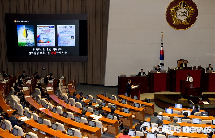 (서울=포커스뉴스) 19일 오후 서울 여의도 국회에서 열린 344회 국회(임시회) 1차 본회의, 사드(THAAD·고고도미사일방어체계) 배치에 대한 긴급현안질문에 참석한 전희경 새누리당 의원이 황교안 국무총리에게 사드배치 괴담과 관련 질문하고 있다.