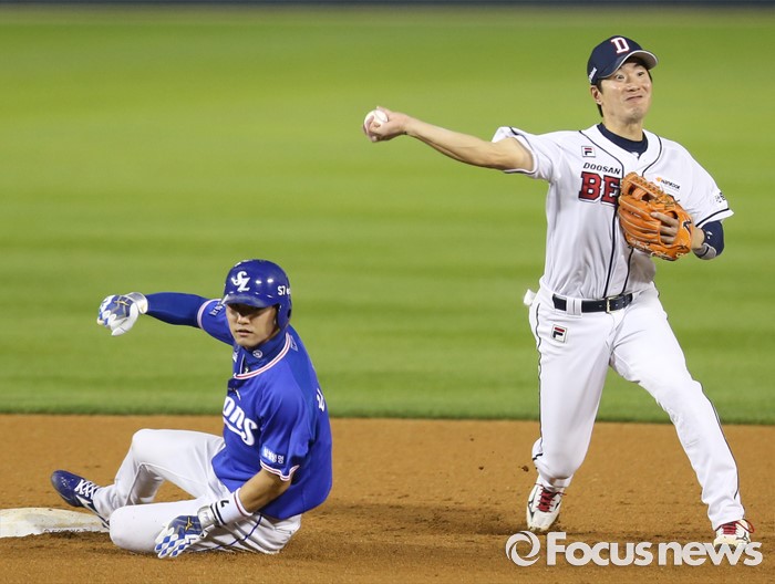 (서울=포커스뉴스) 19일 서울 잠실구장에서 열린 2016 프로야구 삼성-두산 경기 7회초 1사 1,2루에서 두산 유격수 김재호가 삼성 구자욱의 2루 땅볼때 1루주자 김상수를 2루에서 포스아웃 시키고 더블플레이를 노리며 1루로 송구하고 있다.