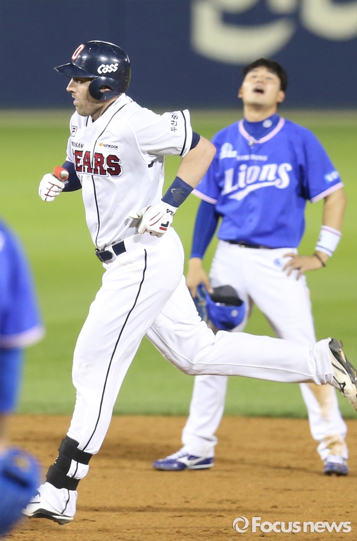(서울=포커스뉴스) 19일 서울 잠실구장에서 열린 2016 프로야구 삼성-두산 경기 7회말 1사 1루에서 두산 에반스가 좌월 2점 홈런을 치고 베이스를 돌고 있다. 삼성 유격수 김상수의 모습이 애처롭다.