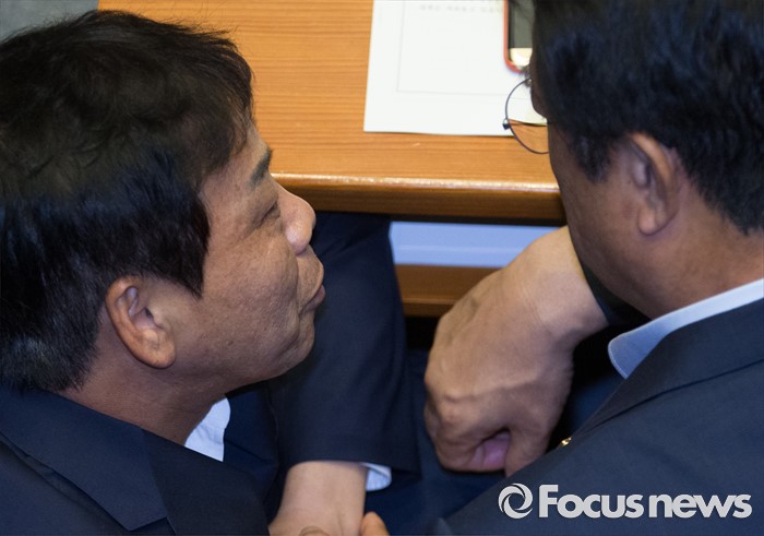 (서울=포커스뉴스) 20일 오전 서울 여의도 국회에서 열린 344회 국회(임시회) 2차 본회의, 사드(THAAD·고고도미사일방어체계) 배치에 대한 긴급현안질문에 참석한 정진석(오른쪽) 새누리당 원내대표와 이완영 의원이 대화하고 있다.