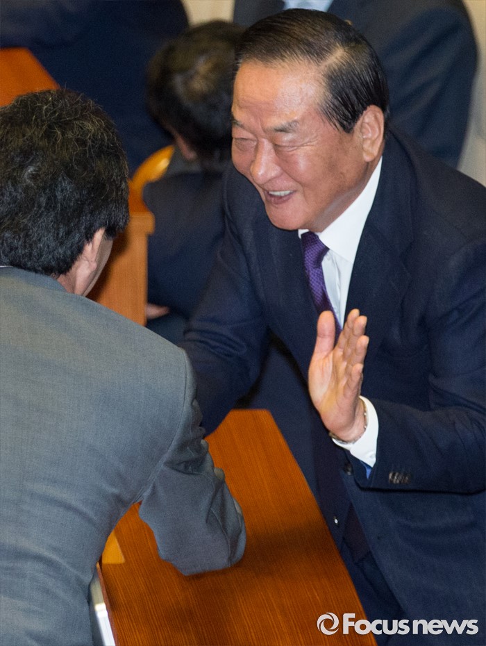 (서울=포커스뉴스) 20일 오전 서울 여의도 국회에서 열린 344회 국회(임시회) 2차 본회의, 사드(THAAD·고고도미사일방어체계) 배치에 대한 긴급현안질문에 참석한 서청원(오른쪽), 유승민 새누리당 의원이 인사하고 있다.