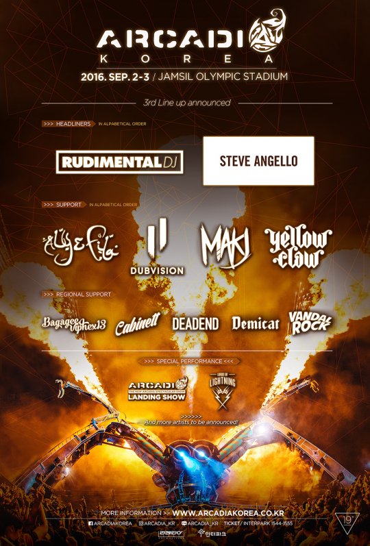 주최사 리켄티아는 아카디아 코리아 페스티벌 개최 소식과 함께 '알리앤필라' '옐로우클로' '바가지 바이펙스써틴' '데드엔드' '캐비닛' '데미캣' '반달락' 등 3차 DJ 라인업을 공개했다.