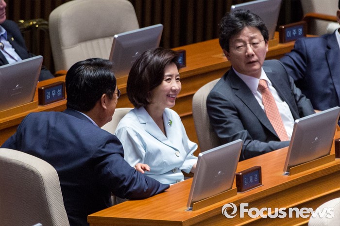 (서울=포커스뉴스) 정진석(왼쪽) 새누리당 원내대표와 나경원(가운데) 새누리당 의원, 유승민 새누리당 의원이 20일 오전 서울 여의도 국회에서 열린 344회 국회(임시회) 2차 본회의, 사드(THAAD, 고고도미사일방어체계) 배치에 대한 긴급현안질문에 참석해 대화 하고 있다.