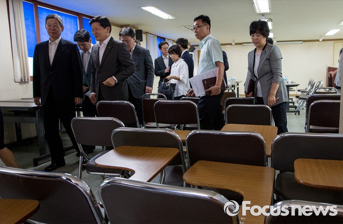 (서울=포커스뉴스) 20일 오전 서울 중구 남대문지역상담센터에서 김희옥(맨 왼쪽) 새누리당 혁신비대위원장이 지역사회복지활동가들과 대화 후 쪽방촌으로 발걸음을 옮기고 있다. 김 위원장은 이날 간담회를 마친 후 남대문 쪽방촌을 방문, 여름철 무더위 대비와 주민보호대책 마련을 위한 민생행보를 이어갔다.