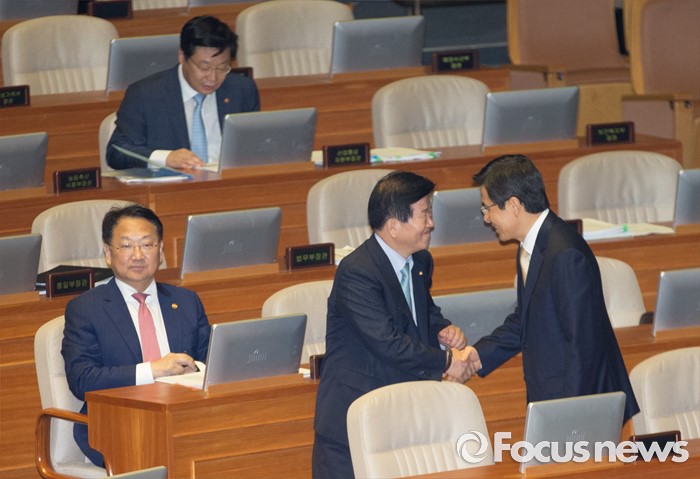 (서울=포커스뉴스) 20일 오후 서울 여의도 국회에서 열린 344회 국회(임시회) 2차 본회의, 사드(THAAD·고고도미사일방어체계) 배치에 대한 긴급현안질문에 참석한 황교안(오른쪽) 국무총리와 박병석 더불어민주당 의원이 악수하고 있다.