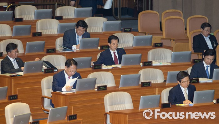 (서울=포커스뉴스) 20일 오후 서울 여의도 국회에서 열린 344회 국회(임시회) 2차 본회의, 사드(THAAD·고고도미사일방어체계) 배치에 대한 긴급현안질문에 참석한 황교안 국무총리 등 국무위원들이 답변준비를 하고 있다.