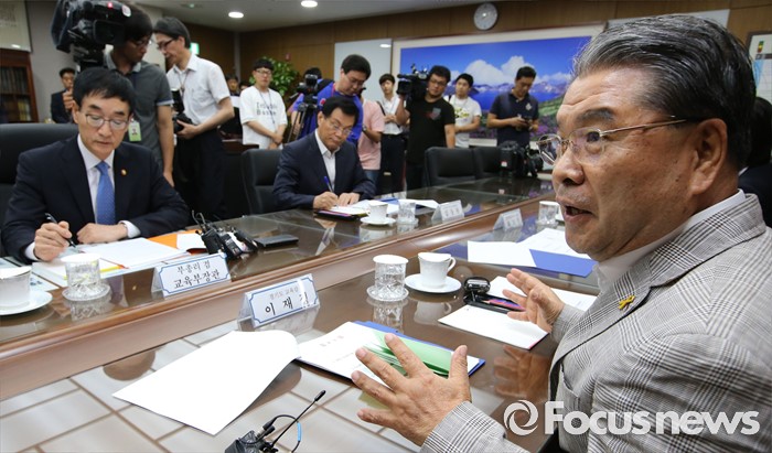 (세종=포커스뉴스) 20일 오후 세종시 정부세종청사 교육부 접견실에서 열린 이준식 사회부총리 겸 교육부장관과 새롭게 구성된 전국시도교육감협의회 회장단 간담회에서 이재정(오른쪽) 협의회장이 인사말을 하고 있다.