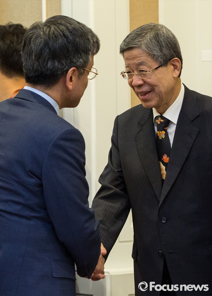 (서울=포커스뉴스) 김희옥(오른쪽) 새누리당 혁신비상대책위원장과 최상목 기획재정부 제1차관이 20일 오후 서울 여의도 국회에서 열린 '조세재정 정책방향 세미나'에 참석해 악수 하고 있다.