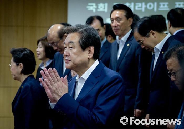 (서울=포커스뉴스) 21일 오전 서울 여의도 국회 의원회관에서 열린 퓨처라이프포럼 2기 출범식 및 세미나에 참석한 김무성 새누리당 전 대표가 의원들과 함께 기념촬영을 마친 뒤 자리로 향하고 있다.