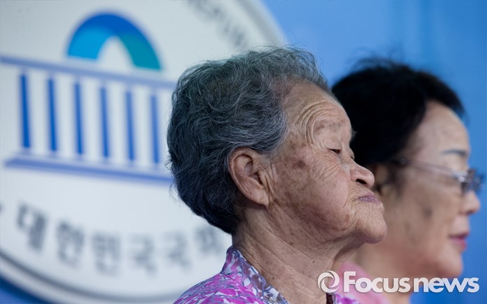 (서울=포커스뉴스) 21일 오전 서울 여의도 국회 정론관에서 유은혜 더불어민주당 의원, 최성 고양시장, 이용수, 박옥선, 이옥선 할머니 등이 위안부 특별법 입법 청원 기자회견을 하고 있다.