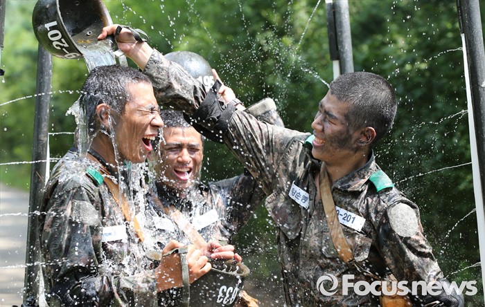 (논산=포커스뉴스) 폭염경보가 발령된 21일 충남 논산 연무읍 육군훈련소 각개전투종합훈련장에서 26교육연대 3교육대 훈련병들이 훈련을 받고 샤워를 하며 더위를 식히고 있다.