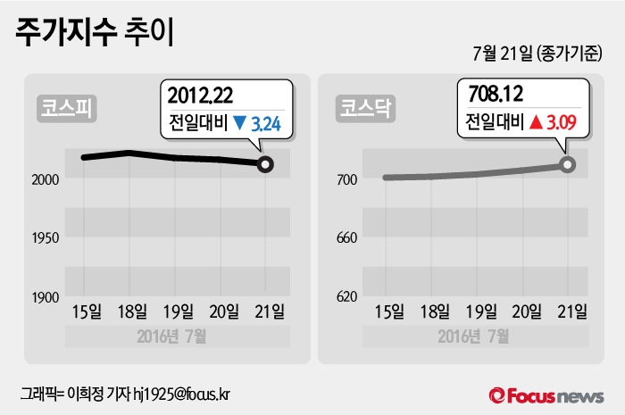 (서울=포커스뉴스) 21일 코스피지수는 전날보다 0.16%(3.24포인트) 내린 2012.22에 장을 마쳤다. 코스닥지수는 전일 대비 0.44%(3.09포인트) 오른 708.12에 마감했다.