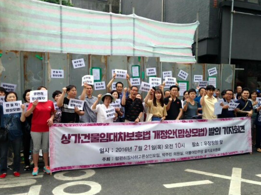 맘상모는 박주민 의원 등과 21일 서울 강남구 신사동의 리쌍 소유 건물 앞에서 기자회견을 갖고 환산보증금 폐지 및 임대차 기간 내 퇴거 대책 마련 등을 골자로 한 맘상모법 개정안을 이날 발의하겠다고 밝혔다.
