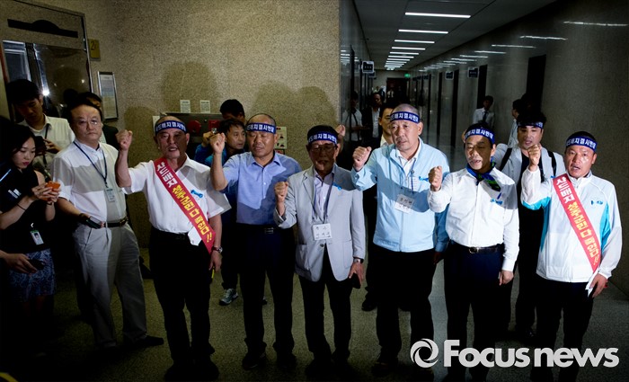 (서울=포커스뉴스) 21일 오후 서울 여의도 국회에서 이완영 새누리당 의원과 김항곤 성주군수 등 성주 사드배치 저지 투쟁위원회 관계자들이 정진석 원내대표 등 지도부와의 면담에 앞서 취재진 앞에 서서 구호를 외치고 있다.
