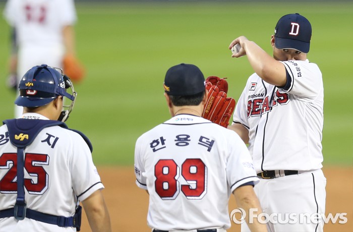 (서울=포커스뉴스) 21일 서울 잠실구장에서 열린 2016 프로야구 삼성-두산 경기 3회초 2사 1루에서 두산 선발투수 유희관이 마운드로 올라오는 한용덕 코치를 바라보고 있다.