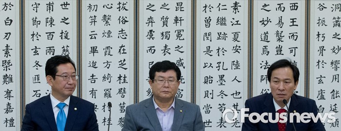 (서울=포커스뉴스) 22일 오전 서울 여의도 국회 귀빈식당에서 열린 한반도 경제·문화포럼 창립총회에 참석한 우상호 더불어민주당 원내대표가 인사말을 하고 있다. 왼쪽부터 김한정, 설훈 의원, 우 원내대표.