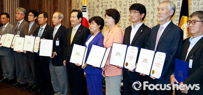 (서울=포커스뉴스) 22일 오전 서울 여의도 국회 의장접견실에서 열린 국회 공직자윤리위원회 위촉식에 참석한 정세균 국회의장이 윤성식 위원장 등 위원들과 기념촬영을 하고 있다. 왼쪽부터 최영식, 장성관, 김서기, 우양태 위원, 윤성식 위원장, 정 의장, 조배숙 부위원장, 김승희, 박완주, 유민봉, 전병준 위원.