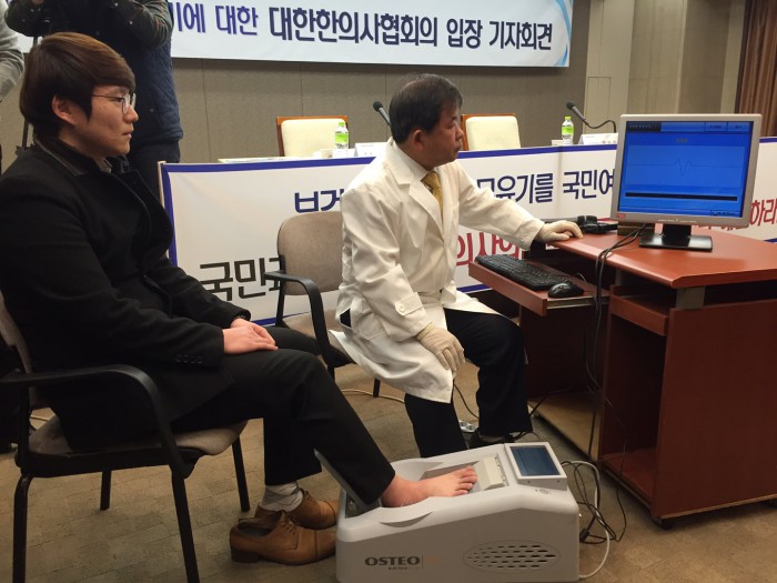 그는 “지금까지 사법부는 의료행위의 범위를 양방 공급자 중심으로 판단했지만, 대법원은 환자 등수요자 중심에서 바라봤다”며 “이 판결을 계기로 한의사 의료기기 사용 관련 재판에도 영향을 미칠 것이라고 생각한다”고 강조했다.김필건 대한한의사협회장이 골밀도 측정기를 시연하고 있는 모습. <사진=민승기 기자>