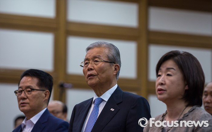(서울=포커스뉴스) 야3당 대표가 22일 오후 서울 여의도 국회의원회관에서 열린 '5.18 왜곡 방지와 관련 법안 개정(처별규정) 위한 국민 토론회'에 참석해 애국가 제창 하고 있다. 왼쪽부터 박지원 국민의당 비상대책위원장, 김종인 더불어민주당 비상대책위 대표, 심상정 정의당 상임대표.