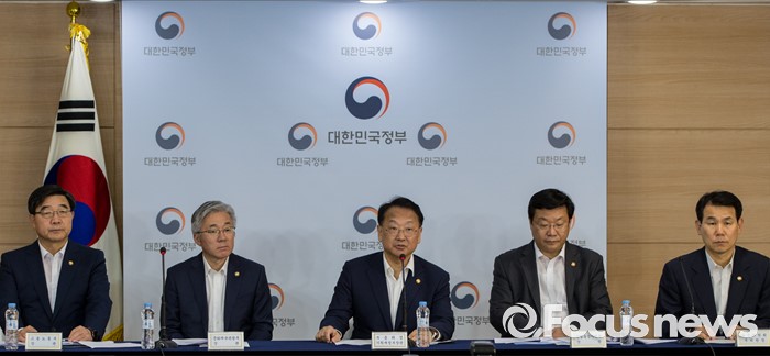 (서울=포커스뉴스) 22일 오후 서울정부청사에서 열린 2016년 추경예산안 합동브리핑에 참석한 유일호 경제부총리 겸 기획재정부 장관이 올해 추경예산 규모를 밝히고 있다. 왼쪽부터 이기권 고용노동부 장관, 김종덕 문화체육관광부 장관, 부총리, 주형환 산업통상자원부 장관,정은보 금융위원회 부위원장.