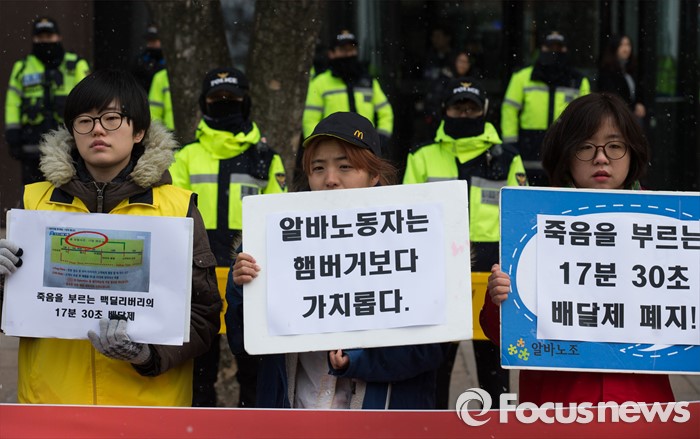 뿐만 아니다. 패스트푸드점 등에서 경쟁적으로 운영하는 '30분 배달제' 등도 알바생을 위험으로 내몰고 있다. 지난 달 1일에는 '20분' 배달시간에 쫓겨 신호위반을 하던 20대 패스트푸드 배달원이 마찬가지로 신호위반을 한 택시에 치여 숨진 사고도 있었다.