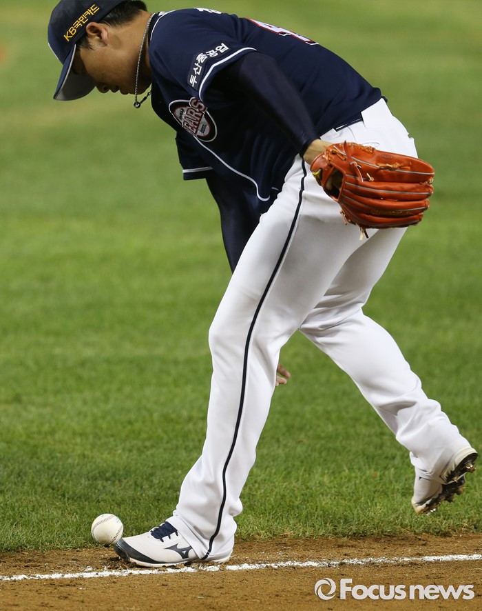 (서울=포커스뉴스) 24일 서울 잠실구장에서 열린 2016 프로야구 두산-LG 경기 8회말 두산 투수 정재훈이 LG 김용의의 기습번트 타구가 라인을 벗어날때까지 기다리고 있다.