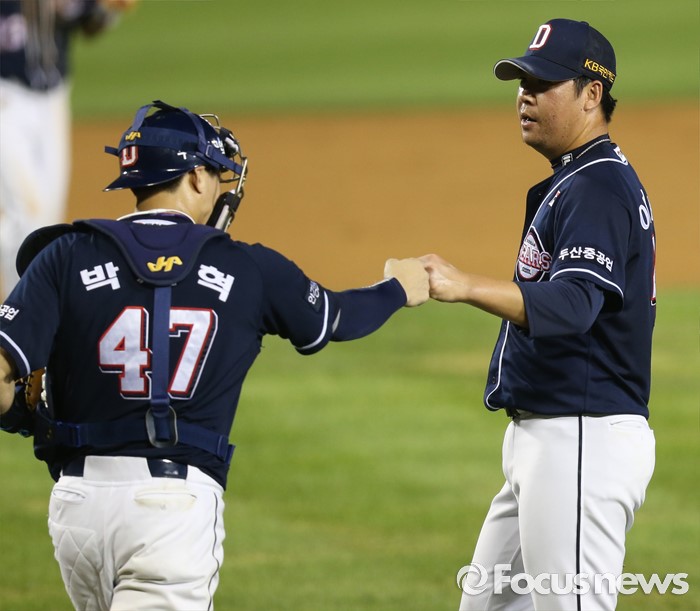 (서울=포커스뉴스) 24일 서울 잠실구장에서 열린 2016 프로야구 두산-LG 경기에서 LG 유강남을 삼진 아웃시키며 경기를 마무리한 투수 이현승이 포수 박세혁과 주먹을 마주치고 있다.