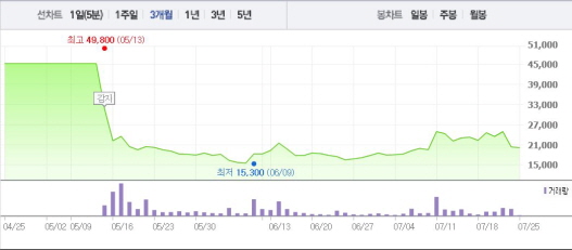앞서 기업매각(M&A) 인수의향서 접수 마감 결과에서는 총 9개 업체가 인수의향서를 제출했다. 7개 업체가 본입찰에서 입찰서를 제출하지 않았다는 점이 주가를 끌어내리는 것으로 보인다. 삼부토건은 지난 2월 회생계획 인가 결정을 받은 뒤 지난 6월 매각관련 공고를 냈다.주가흐름<사진출처=네이버 캡쳐>