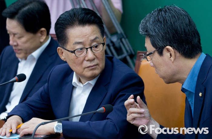 (서울=포커스뉴스) 25일 오전 서울 여의도 국회에서 열린 국민의당 비상대책위원회의에 참석한 박지원(가운데) 비대위원장과 김성식(오른쪽) 정책위의장이 대화하고 있다.