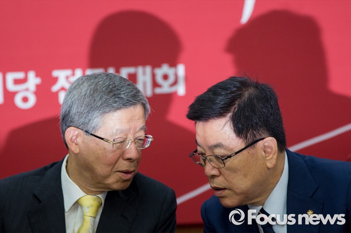 (서울=포커스뉴스) 김희옥(왼쪽) 새누리당 혁신비상대책위원장과 김광림 정책위의장이 25일 오전 서울 여의도 새누리당사에서 열린 혁신비상대책위원회의에 참석해 대화 하고 있다.