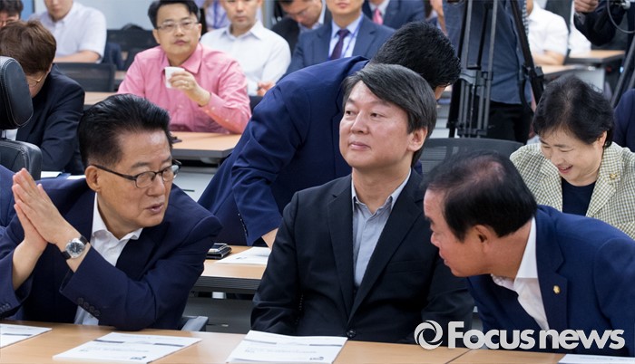 (서울=포커스뉴스) 25일 오전 서울 여의도 국회 의원회관에서 열린 '왜 협력이익배분제 인가?, 협력이익배분제 법제화의 필요성 세미나'에 참석한 박지원(왼쪽부터) 국민의당 비상대책위원장, 안철수 전 대표, 장병완 국회 산업통상자원위원장이 대화하고 있다.