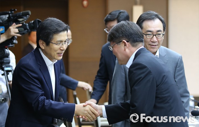 (세종=포커스뉴스) 황교안 국무총리가 25일 오후 세종시 정부세종청사 국무총리실에서 열린 원자력진흥위원회에서 참석자와 악수를 하고 있다.