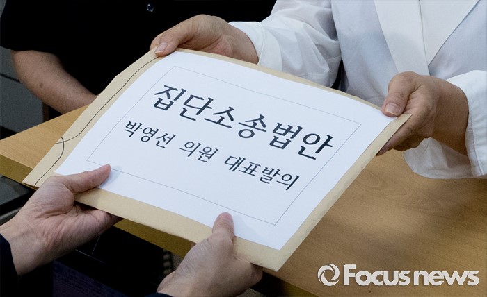 (서울=포커스뉴스) 박영선 더불어민주당 의원과 관계자들이 26일 오전 서울 여의도 국회 의안과에서 집단소송법 제정 법안을 제출하고 있다. 박 의원은 앞서 기자회견을 통해 "미국에만 거액 배상을 합의한 폭스바겐측의 행태는 현행 민사소송법 한계를 드러낸 것으로 우리 국민들의 적절한 피해배상과 신속한 권리구제를 위해 징벌적 배상제 도입과 함께 집단소송제 도입이 시급해 대표발의했다"고 전했다.
