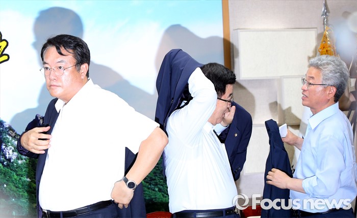 (성주=포커스뉴스) 26일 오전 경북 성주군청을 찾은 정신석 새누리당 원내대표와 지도부들이 성주군민들과 간담회를 마치고 자리에서 일어나고 있다.